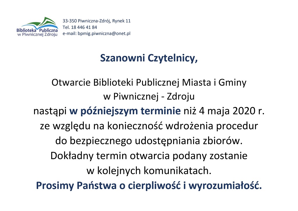 Komunikat: Biblioteka Publiczna w Piwnicznej-Zdroju dot. otwarcia