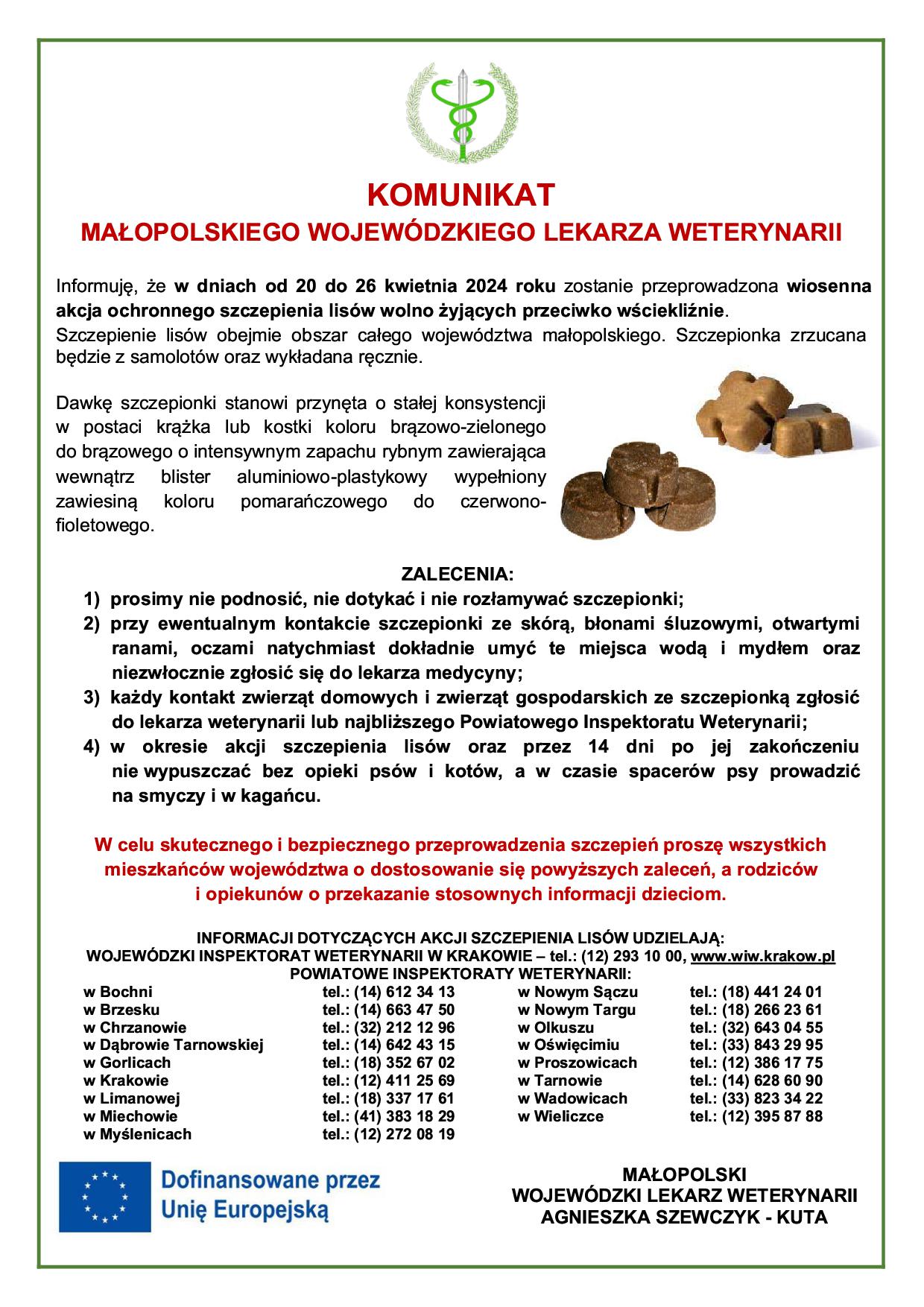 KOMUNIKAT Małopolskiego Wojewódzkiego Lekarza Weterynarii dot. akcji ochronnego szczepienia lisów 20-26.04.2024 r.