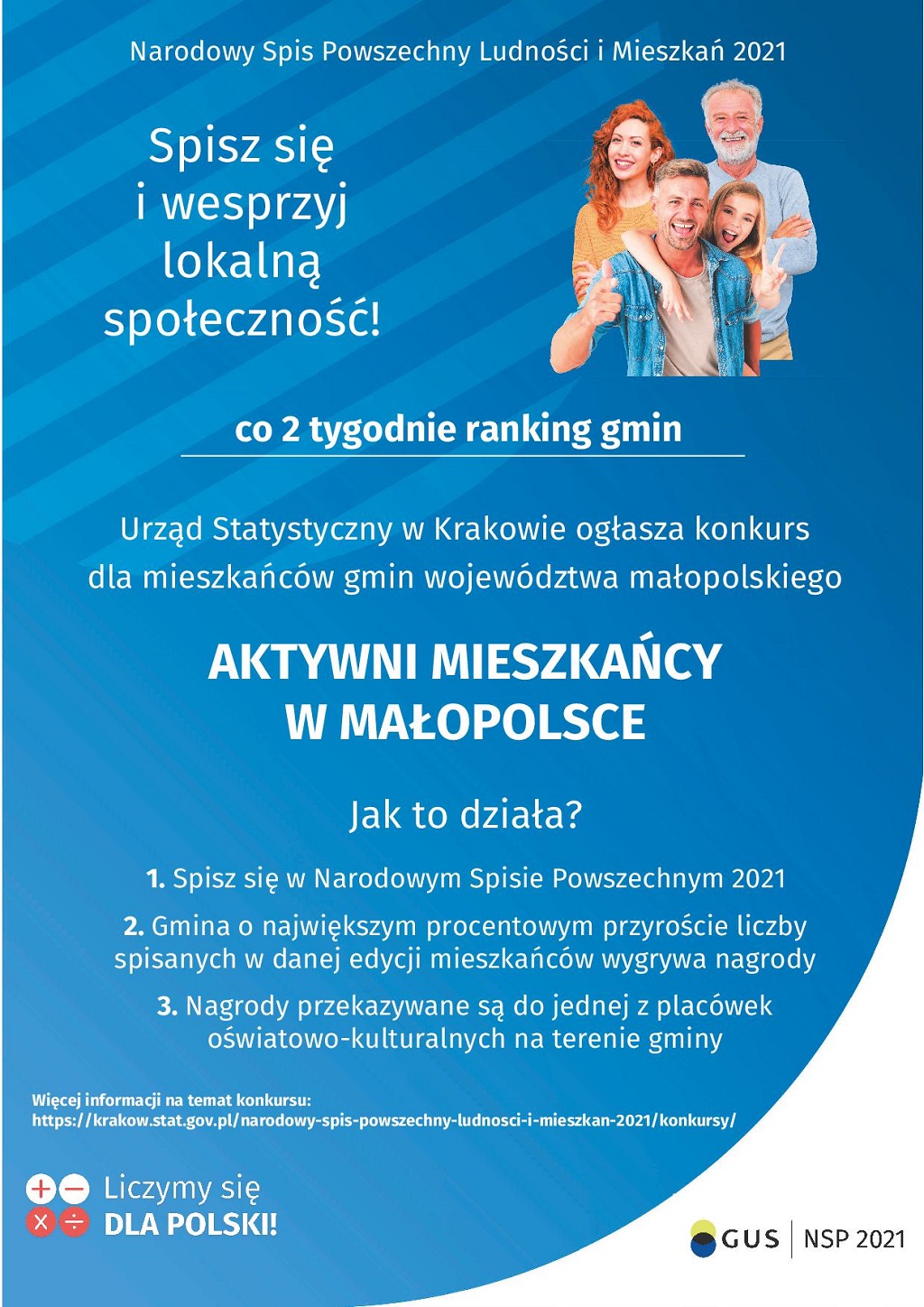 W ramach promocji Narodowego Spisu Powszechnego Ludności i Mieszkań 2021 Urząd Statystyczny w Krakowie organizuje konkurs „Aktywni mieszkańcy w Małopolsce”. Konkurs adresowany jest do wszystkich mieszkańców województwa, którzy poprzez udział w Narodowym Spisie Powszechnym Ludności i Mieszkań 2021, mają możliwość wypromowania swojej gminy oraz wsparcia znajdujących się na jej terenie jednostek oświatowo-kulturalnych.