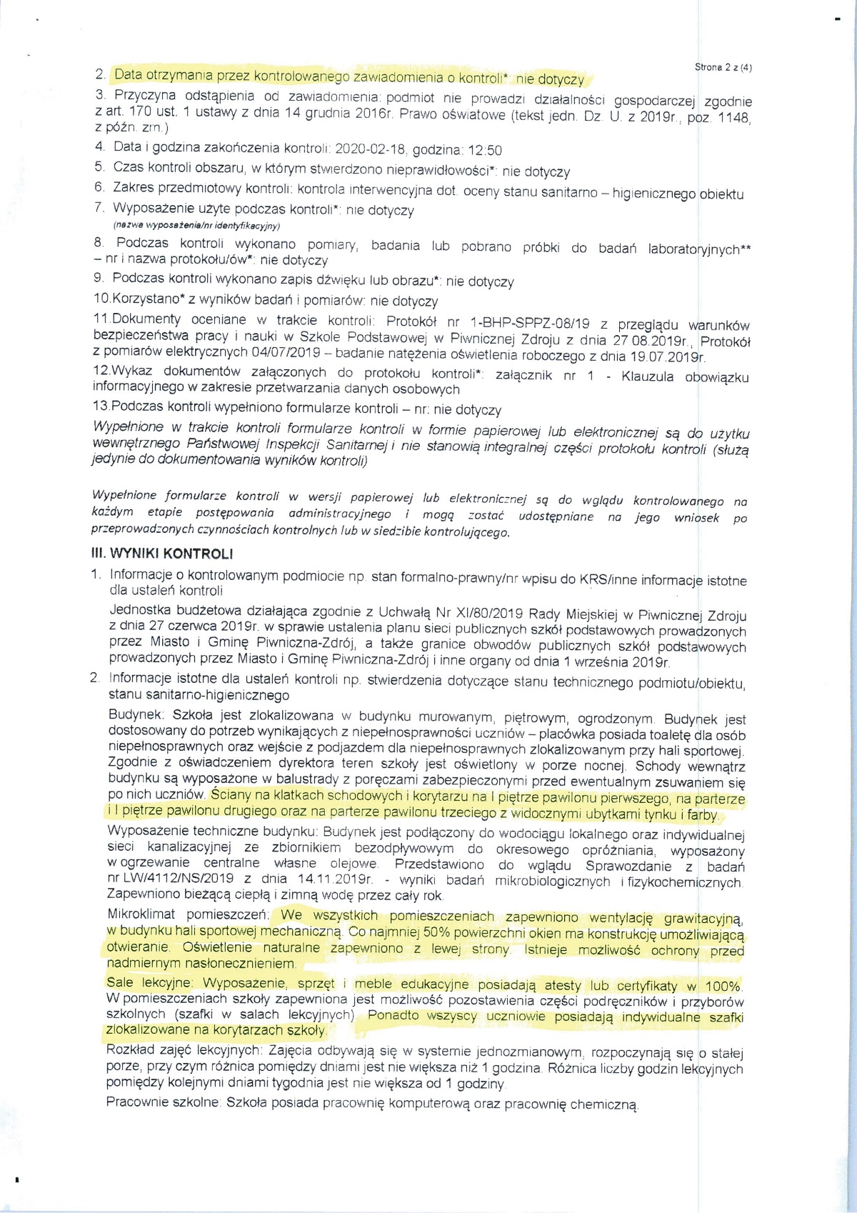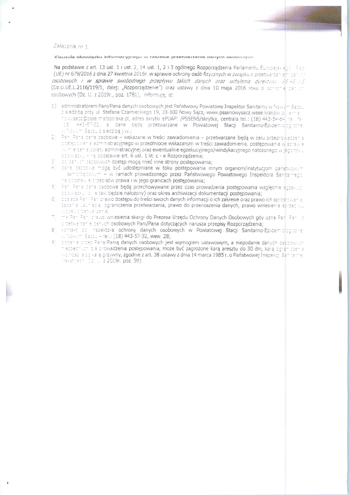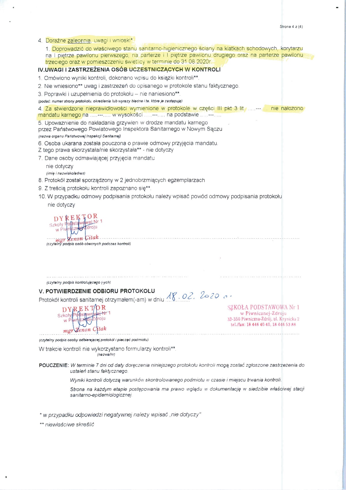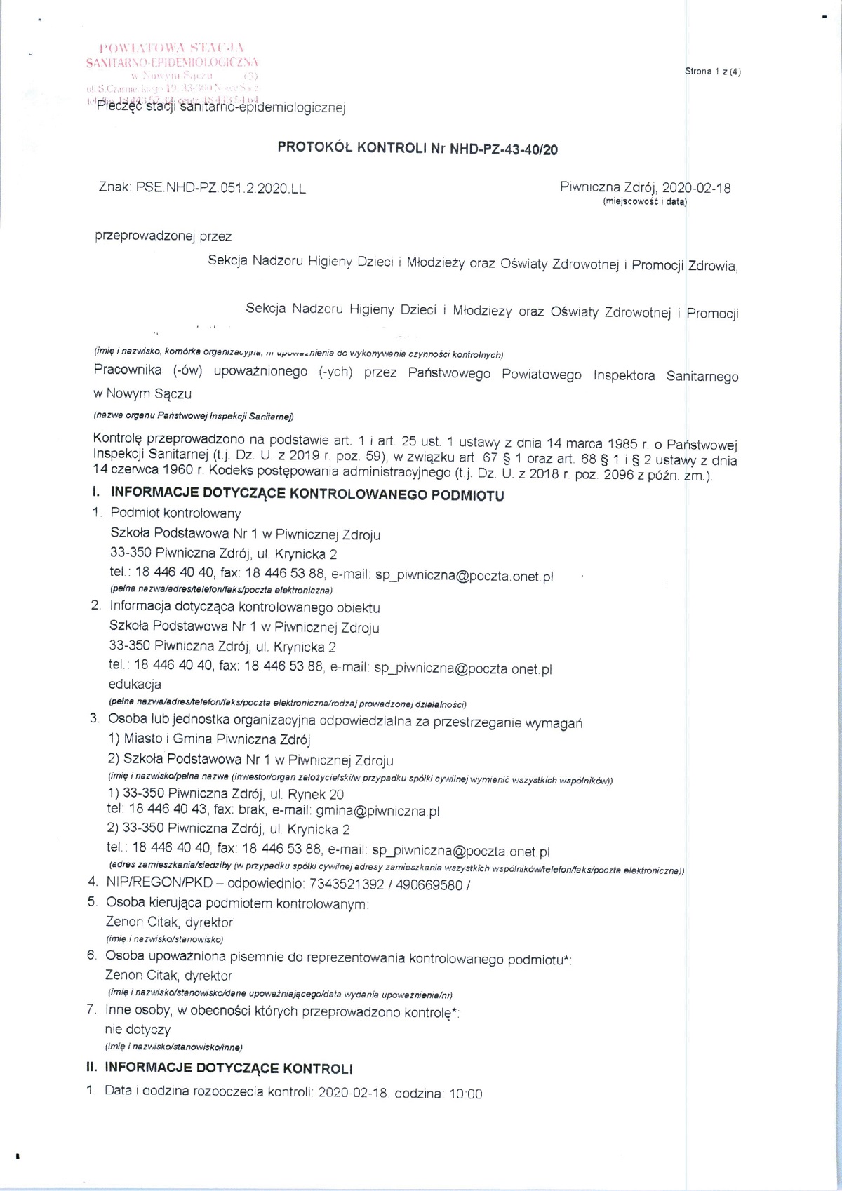 W nawiązaniu do pojawiających się informacji dotyczących przeprowadzonej kontroli przez Powiatową Stację Sanitarno-Epidemiologiczną w Nowym Sączu w dniu 18.02.2020 r. w załączeniu umieszczam Protokół Kontroli Nr NHD-PZ-43-40/20.