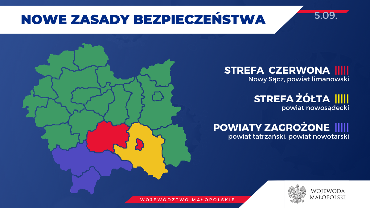 W Małopolsce do strefy czerwonej zaliczono powiat limanowski i miasto Nowy Sącz. W strefie żółtej znalazł się natomiast powiat nowosądecki. Na ostrzegawczej liście powiatów zagrożonych dodatkowymi obostrzeniami jest powiat tatrzański i powiat nowotarski. Zmiany obowiązują od soboty 5 września 2020 r.