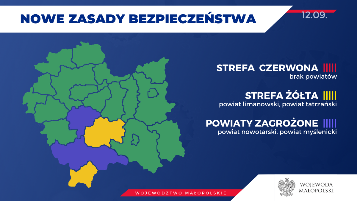 W Małopolsce do strefy żółtej zaliczono powiat limanowski i powiat tatrzański. Żaden powiat nie został zakwalifikowany do strefy czerwonej. Na ostrzegawczej liście powiatów zagrożonych dodatkowymi obostrzeniami znalazły się powiat nowotarski i powiat myślenicki.