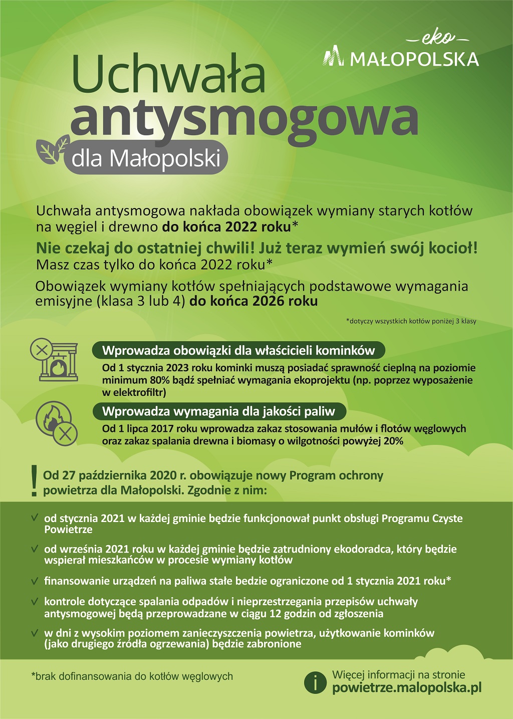 Cel Programu jest poprawa jakości powietrza oraz zmniejszenie emisji gazów cieplarnianych poprzez wymianę źródeł ciepła i poprawę efektywności energetycznej budynków mieszkalnych jednorodzinnych. Dotacja może wynosić do 30 000 zł dla podstawowego poziomu dofinansowania i 37 000 zł dla podwyższonego poziomu dofinansowania. Wszelkie szczegóły w broszurach do pobrania oraz na stronie http://czystepowietrze.gov.pl/wez-dofinansowanie/
