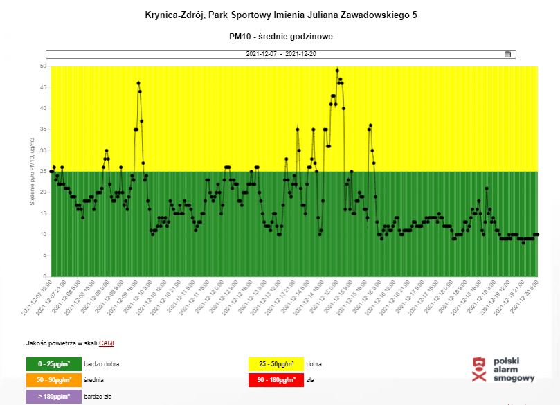Od 7 do 20 grudnia, w ramach ostatniego etapu akcji „Małopolska bez smogu” realizowanej przez Radio Kraków i Polski Alarm Smogowy przy wsparciu Województwa Małopolskiego, przenośne pyłomierze badały jakość powietrza w dwóch małopolskich uzdrowiskach: Krynicy-Zdroju i Piwnicznej-Zdroju. Okres pomiarowy objął 11 pełnych dób, w trakcie których norma dobowa dla pyłu zawieszonego PM10 została przekroczona dwa razy w Piwnicznej (14 i 15 grudnia 2021 r.). W tym okresie (13- 14 grudnia), w niektórych małopolskich powiatach, mieliśmy do czynienia z przekroczeniem poziomu informowania oraz ryzykiem wystąpienia poziomu alarmowego dla pyłu zawieszonego PM10, co było związane z warunkami pogodowymi utrudniającymi rozprzestrzenianie się zanieczyszczeń, powstałych w wyniku spalania węgla i drewna w gospodarstwach domowych. W Krynicy-Zdrój w badanym terminie norma dobowa nie została przekroczona.