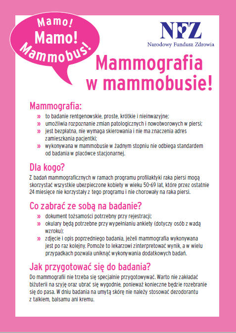 Zapraszamy ubezpieczone Panie w wieku od 50 do 69 lat, które przez ostatnie 24 miesiące nie korzystały z tego badania lub otrzymały pisemne wskazanie do ponownego wykonania badania po upływie 12 miesięcy i nie były leczone z powodu raka piersi. Mammografia jest bezpłatna, nie wymaga skierowania i wykonywana jest niezależnie od miejsca zamieszkania pacjentki.
