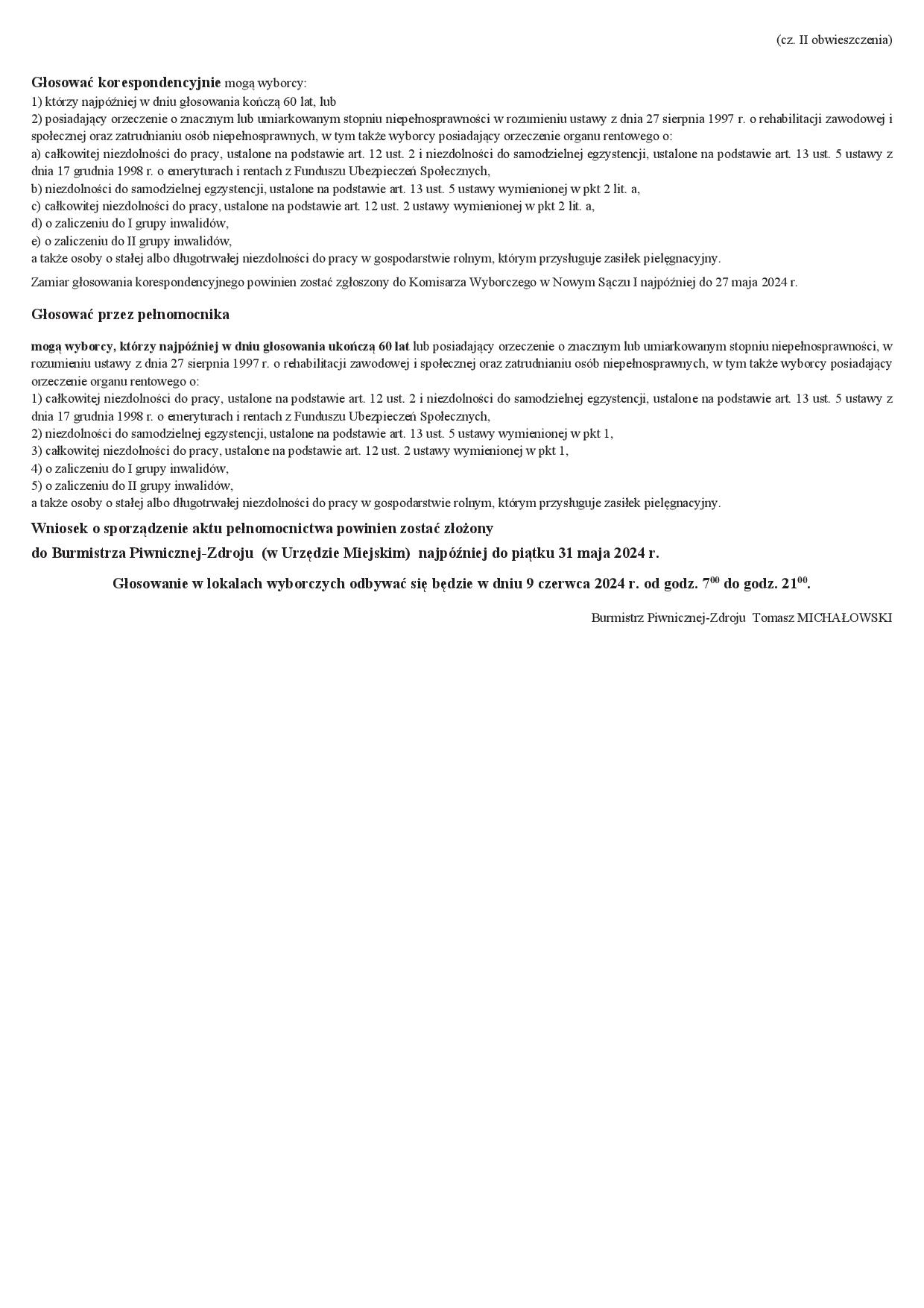 OBWIESZCZENIE Burmistrza Piwnicznej-Zdroju z dnia 10 maja 2024 r. o numerach oraz granicach obwodów głosowania w wyborach do Parlamentu Europejskiego zarządzonych na dzień 9 czerwca 2024 r.