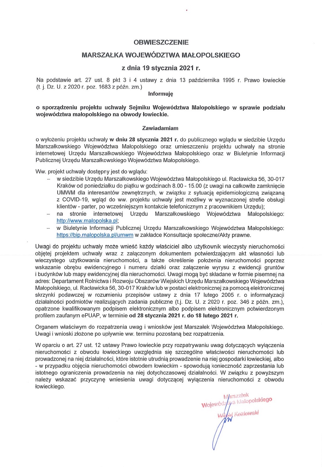 OBWIESZCZENIE Marszałka Województwa Małopolskiego z dnia 19 stycznia 2021 r.