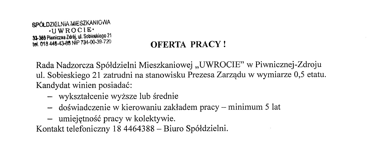 OFERTA PRACY! Spółdzielnia Mieszkaniowa "UWROCIE" w Piwnicznej-Zdroju