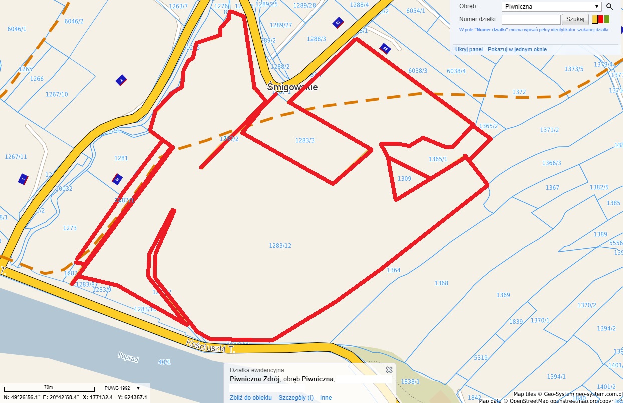 Przeznaczony do sprzedaży grunt położony jest w północno – wschodniej części miasta Piwniczna-Zdrój na osiedlu Śmigowskie, na malowniczej części stoku wzniesienia nad Popradem.