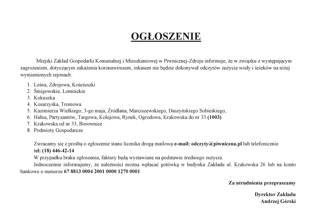 OGŁOSZENIE MZGKiM w Piwnicznej-Zdroju dot. odczytów zużycia wody i ścieków