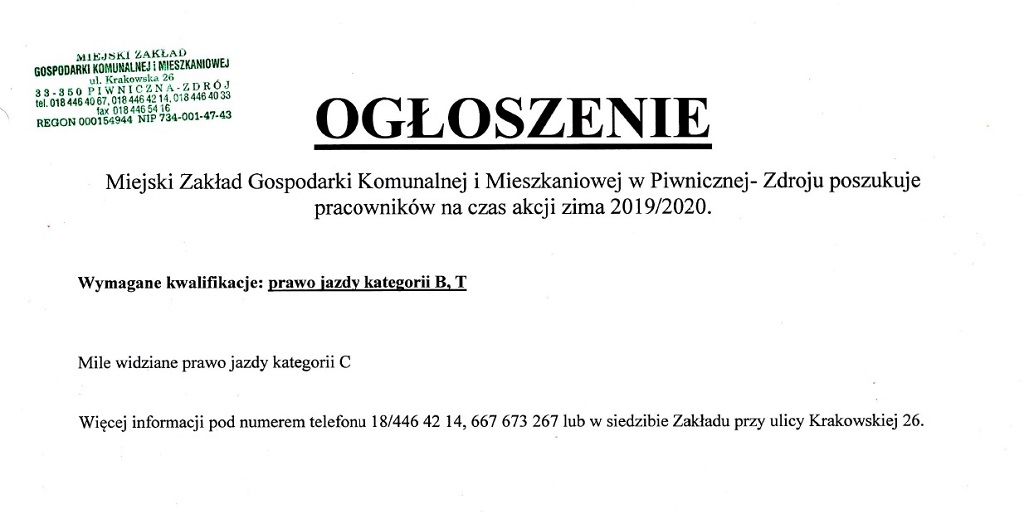 Ogłoszenie MZGKiM w Piwnicznej-Zdroju