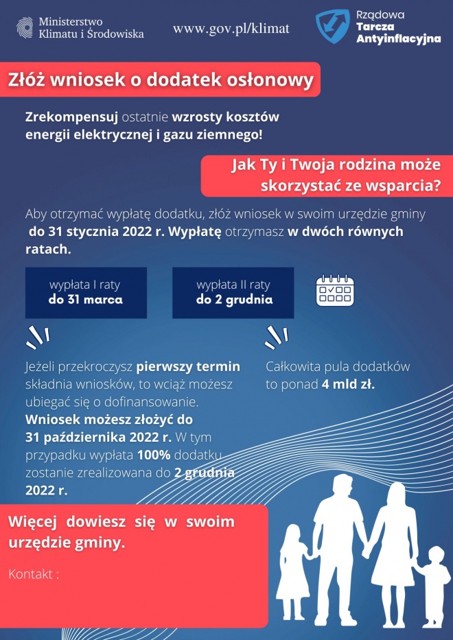 Ośrodek Pomocy Społecznej w Piwnicznej-Zdroju informuje, że od dnia 04.01.2022 r., w ramach Rządowej Tarczy Antyinflacyjnej, przyjmuje wnioski o dodatek osłonowy.