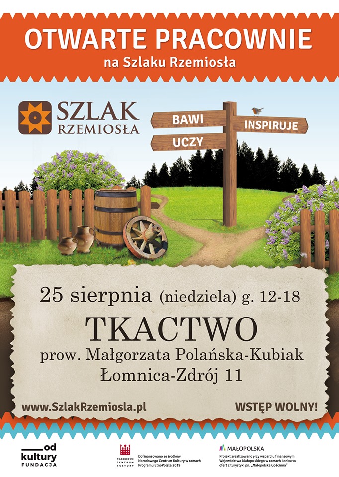 Projekt realizowany jest przy wsparciu Województwa Małopolskiego w ramach konkursu ofert z turystyki pn. "Małopolska Gościnna" oraz dofinansowany ze środków Narodowego Centrum Kultury w ramach Programu EtnoPolska 2019.