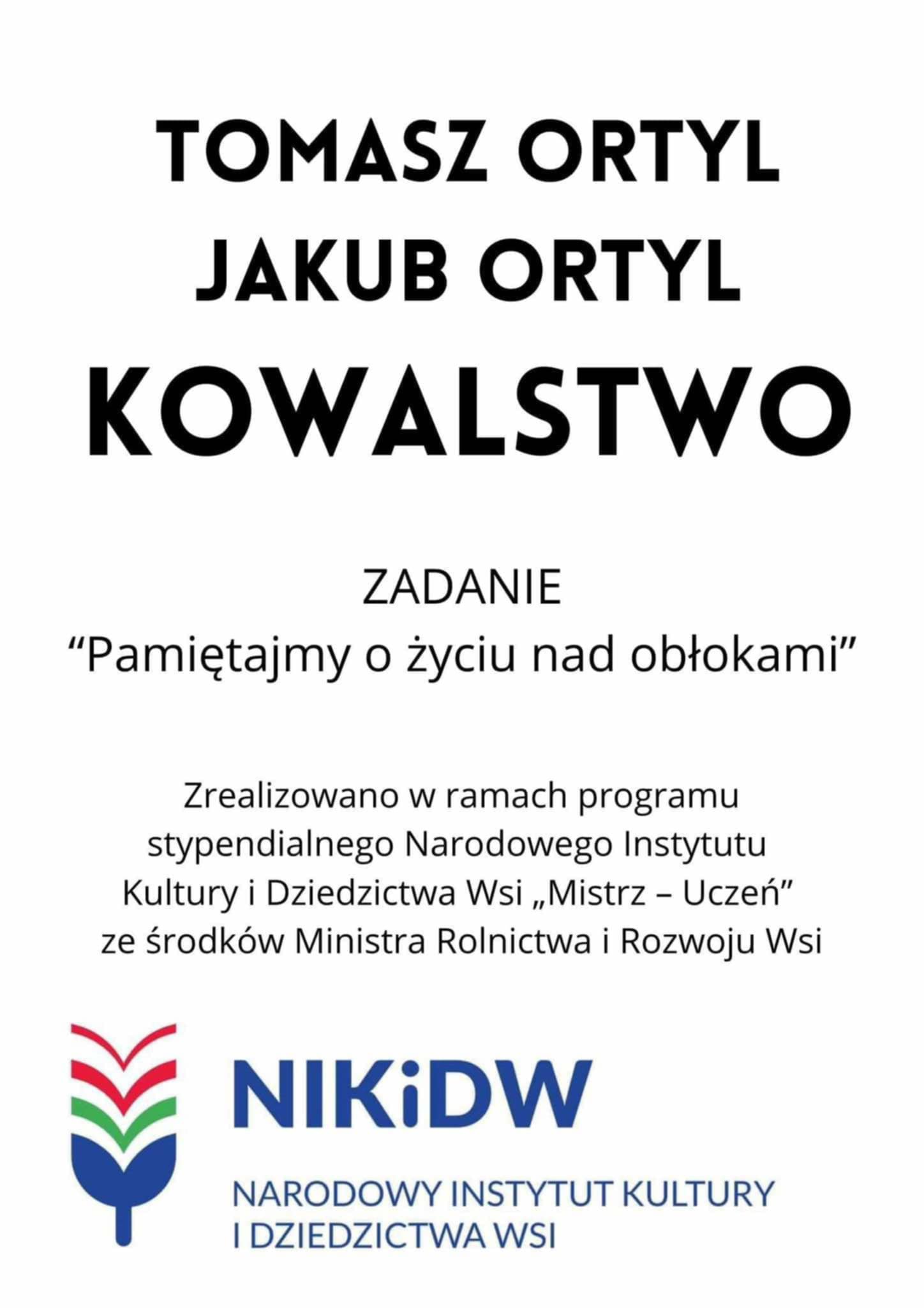 „Pamiętajmy o życiu nad obłokami” to projekt Tomasza i Jakuba Ortyli realizowany w ramach programu stypendialnego „Mistrz Uczeń” Narodowego Instytutu Kultury i Dziedzictwa Wsi. Program skierowany jest do twórców ludowych z terenu Rzeczpospolitej Polskiej. Jego adresatami są zarówno mistrzowie z ugruntowaną już pozycją i dorobkiem, jak i adepci. Regulamin informuję, że podstawowym celem Programu jest ratowanie lokalnego dziedzictwa i tradycji oraz zapewnienie ciągłości autentycznej twórczości ludowej. Priorytety Stypendium dotyczą projektów edukacyjnych, zapewniających bezpośredni przekaz tradycyjnych umiejętności artystycznych, rzemieślniczych i rękodzielniczych, dokonywanych wewnątrz wspólnoty lokalnej, ze szczególnym uwzględnieniem umiejętności zagrożonych zanikiem.