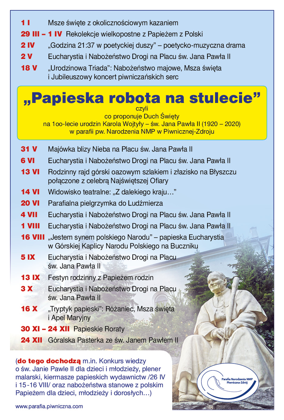 Parafia Narodzenia Najświętszej Maryi Panny w Piwnicznej-Zdroju z okazji 100 - lecia urodzin św. Jana Pawła II (1920-2020) zaprasza w roku 2020 do udziału w całorocznym programie pt. „Papieska robota na stulecie” czyli, co proponuje Duchy Święty. Szczegóły na stronie poniżej.