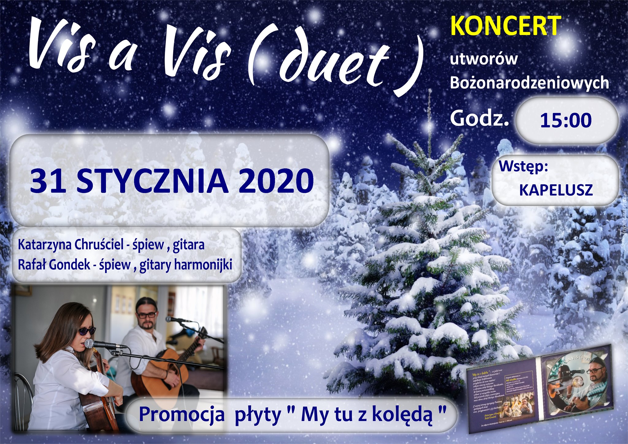 Pijalnia Artystyczna serdecznie zaprasza ponownie na koncert utworów Bożonarodzeniowych, który odbędzie się w piątek 31 stycznia o godz. 15:00. Vis a Vis (duet) Katarzyna Chruściel – śpiew i gitara oraz Rafał Gondek – śpiew i gitary harmonijki. Podczas koncertu odbędzie się promocja płyty pt. „My tu z kolędą”.