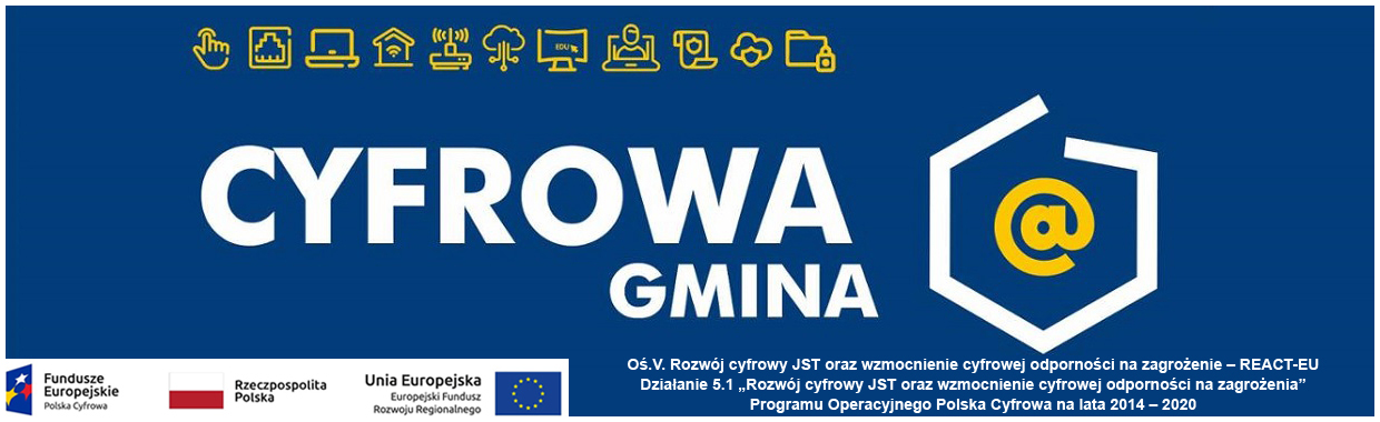 Oś.V. Rozwój cyfrowy JST oraz wzmocnienie cyfrowej odporności na zagrożenie – REACT-EU. Działanie 5.1 „Rozwój cyfrowy JST oraz wzmocnienie cyfrowej odporności na zagrożenia” Programu Operacyjnego Polska Cyfrowa na lata 2014 – 2020. Na realizację projektu grantowego „Cyfrowego Gmina” o numerze POPC.05.01.00-00-0001/21-00
