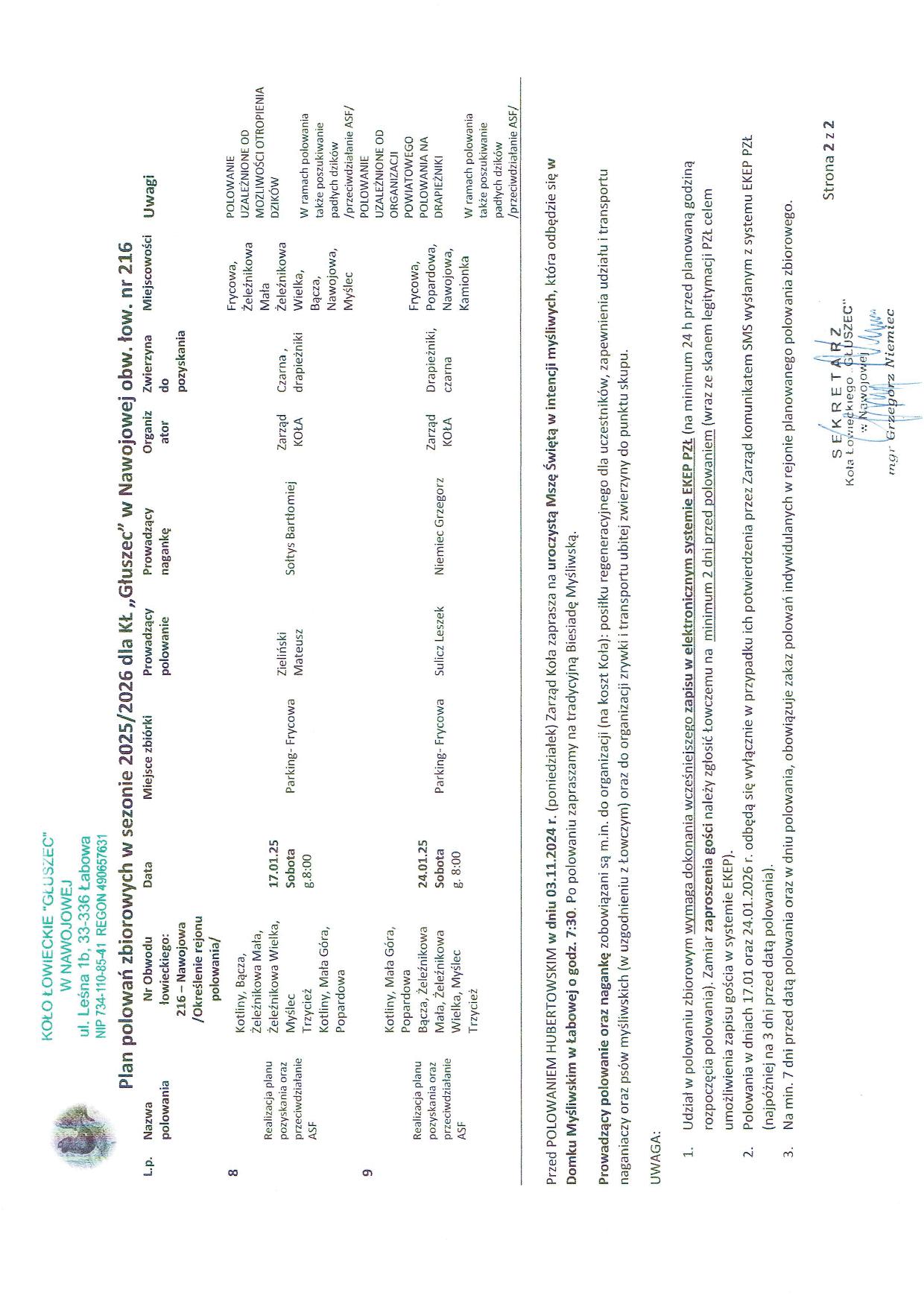 Plan polowań zbiorowych w sezonie łowieckim 2025/2026 dla Koła Łowieckiego "Głuszec" w Nawojowej