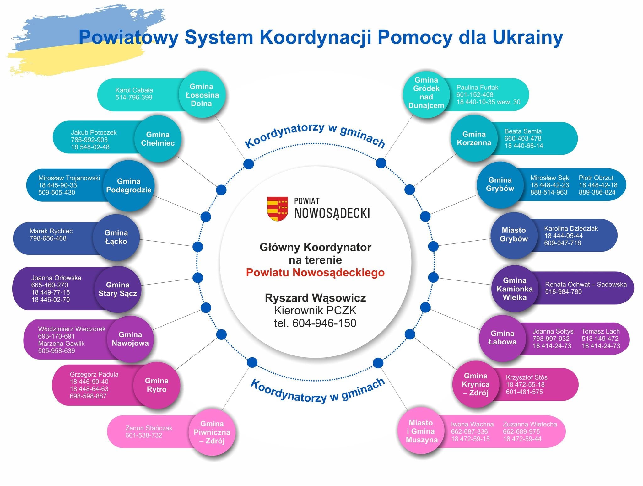 Zbiórki darów są organizowane w każdej z sądeckich gmin. Aby ułatwić mieszkańcom kontakt z osobami odpowiedzialnymi za tę akcję, publikujemy listę nazwisk koordynatorów oraz ich numery telefonów. Koordynacją całości pomocy zajmuje się Powiatowe Centrum Zarządzania Kryzysowego w Nowym Sączu działające całą dobę pod numerami telefonów: 18 41 41 621, 18 41 41 622 i 604-946-150 (kierownik Ryszard Wąsowicz). Wszystkie niezbędne informacje znajdują się też na stronie internetowej: BIP Starostwa Powiatowego w Nowym Sączu / Powiatowe Centrum Zarządzania Kryzysowego / Pomoc dla Ukrainy (nowosadecki.pl)