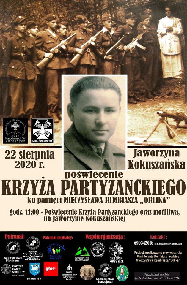 Serdecznie zapraszamy na poświęcenie Krzyża Partyzanckiego ku pamięci MIECZYSŁAWA REMBIASZA „ORLIKA” - Jaworzyna Kokuszańska 22 sierpnia 2020 r. godz. 11:00.
