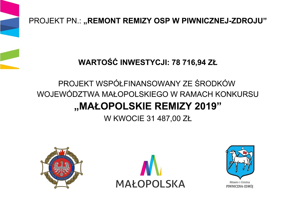 Zakończono realizację zadania pn. „Remont Remizy OSP w Piwnicznej-Zdroju”. Projekt współfinansowany ze środków Województwa Małopolskiego w ramach konkursu „Małopolskie Remizy 2019”.