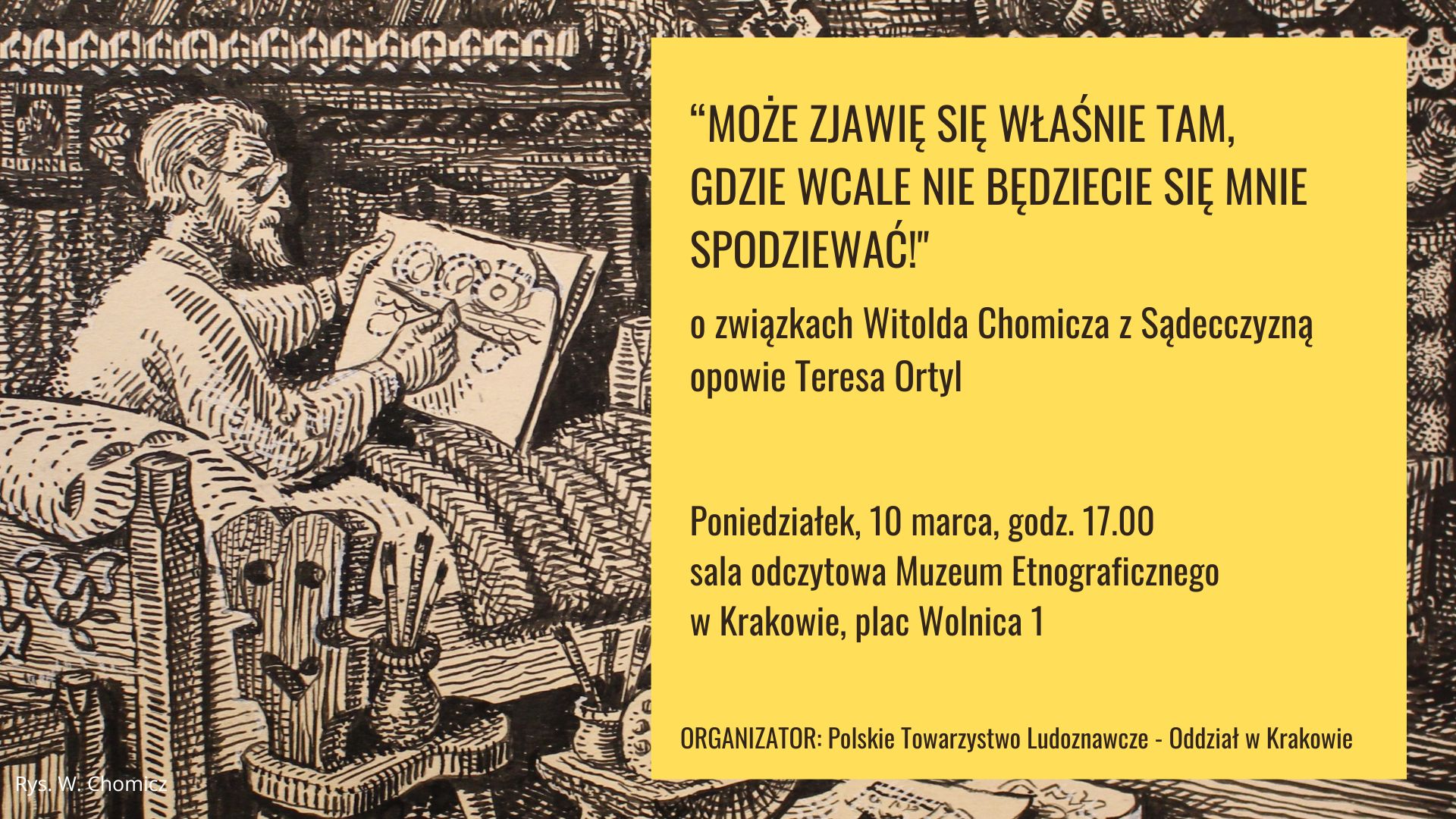 „Może zjawię się właśnie tam, gdzie wcale nie będziecie się mnie spodziewać!" – opowieść o Witoldzie Chomiczu. 10 marca o godzinie 17.00, w sali Odczytowej Muzeum Etnograficznego w Krakowie, przy pl. Wolnica 1. Teresa Ortyl przybliży nam postać Witolda Chomicza.