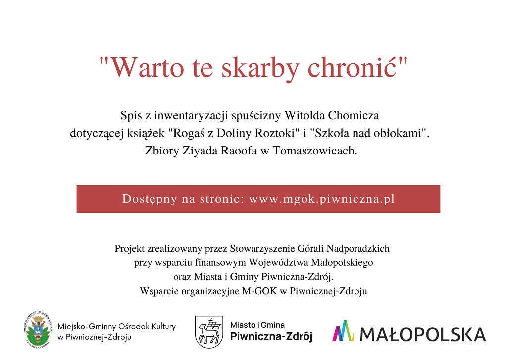 Inwentaryzacja odbyła się w ramach zadania "Warto te skarby chronić" realizowanego przez Stowarzyszenie Górali Nadpopradzkich. Szczególne podziękowania za przyczynienie się do jego realizacji składamy Ziyadowi Raoofowi, właścicielowi zbioru prac Witolda Chomicza, Magdalenie Laskowskiej za przeprowadzenie inwentaryzacji, Zarządowi Województwa Małopolskiego oraz Urzędowi Miasta i Gminy Piwnicznej-Zdroju za wsparcie finansowe, Miejsko-Gminnemu Ośrodkowi Kultury w Piwnicznej-Zdroju za wsparcie organizacyjne.