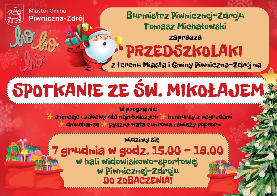 Burmistrz Piwnicznej-Zdroju zaprasza PRZEDSZKOLAKI na spotkanie ze Św. Mikołajem 07.12.2025 r. w godz. 15:00 - 18:00