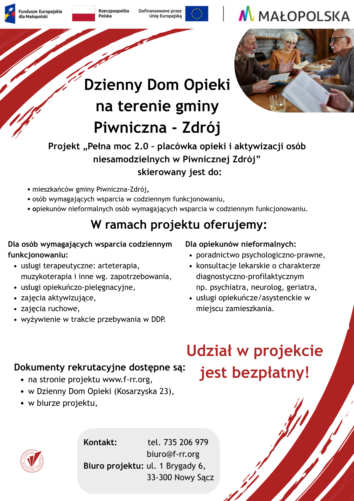 Fundacja Rozwoju Regionów serdecznie zaprasza do udziału w projekcie: Pełna moc 2.0 – placówka opieki i aktywizacji osób niesamodzielnych w Piwnicznej-Zdrój