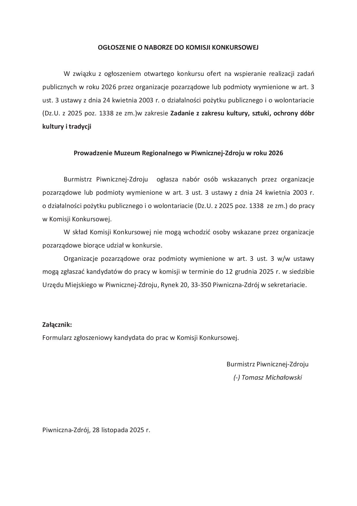 OGŁOSZENIE O NABORZE DO KOMISJI KONKURSOWEJ Prowadzenie Muzeum Regionalnego w Piwnicznej-Zdroju w roku 2026