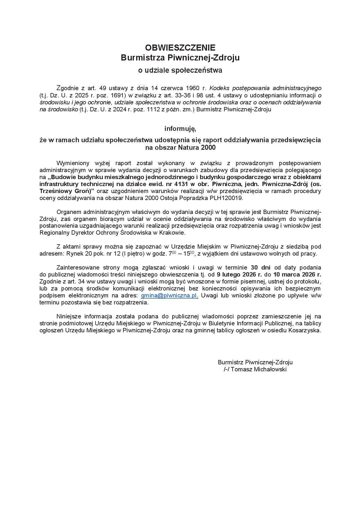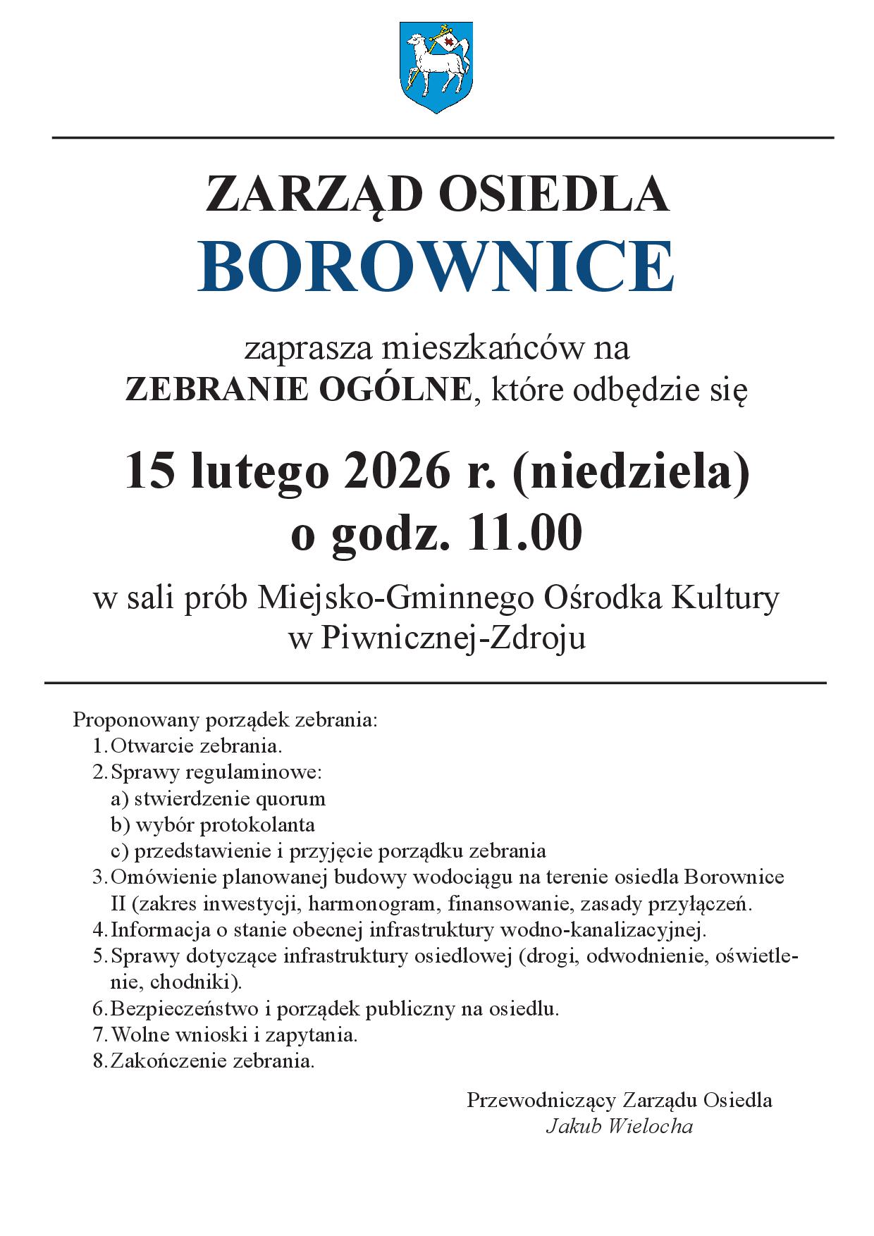 ZARZĄD Osiedla Borownice zaprasza na ZEBRANIE OGÓLNE 15.02.2026 r. (niedziela) godz. 11:00 w MGOK w Piwnicznej-Zdroju