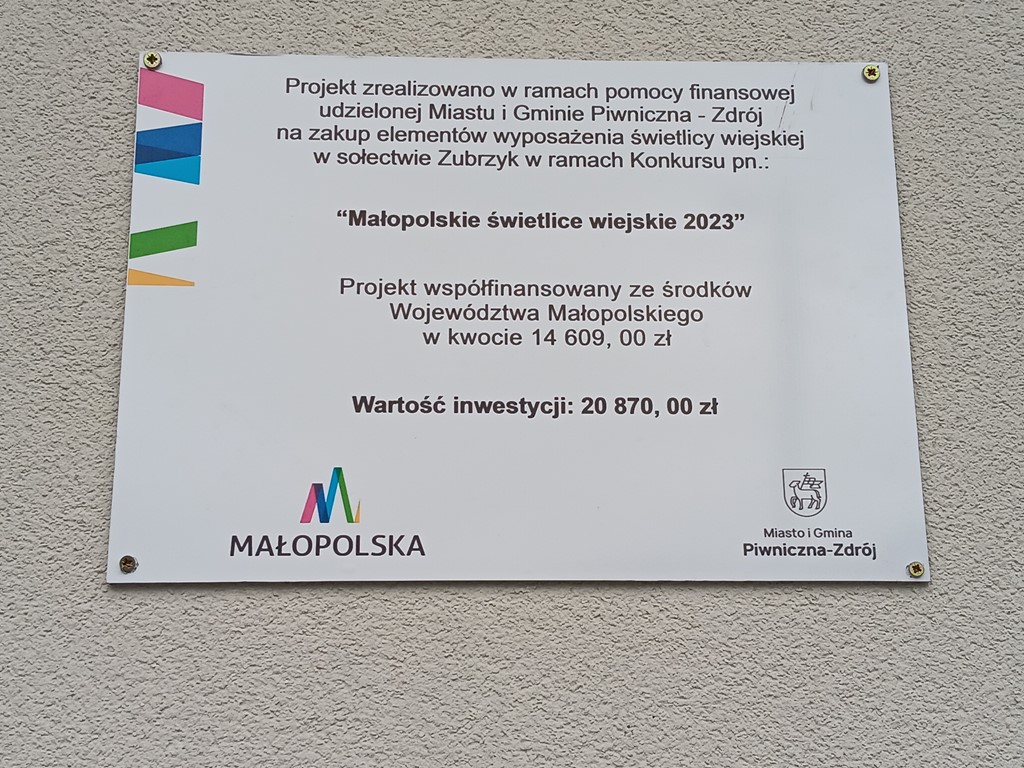 Miasto i Gmina Piwniczna-Zdrój zrealizowano zakup elementów wyposażenia świetlicy wiejskiej w sołectwie Zubrzyk w ramach Konkursu pn. „Małopolskie świetlice wiejskie 2023” współfinansowany ze środków województwa małopolskiego.