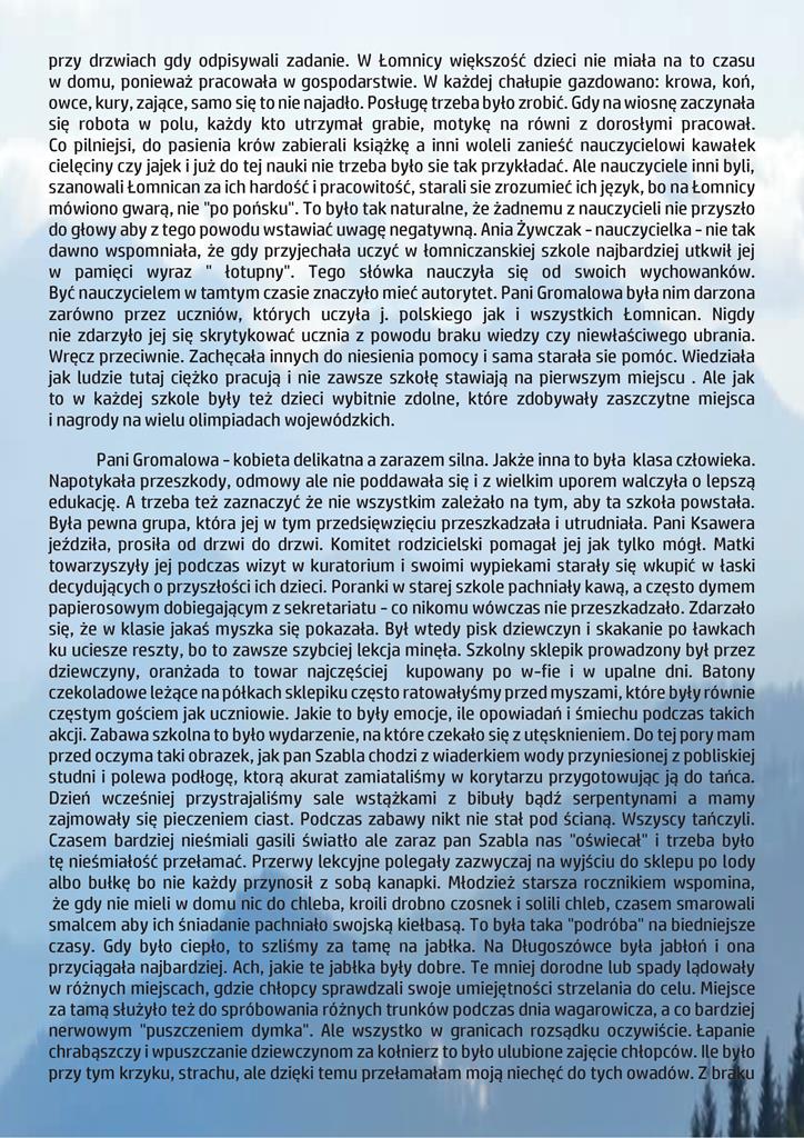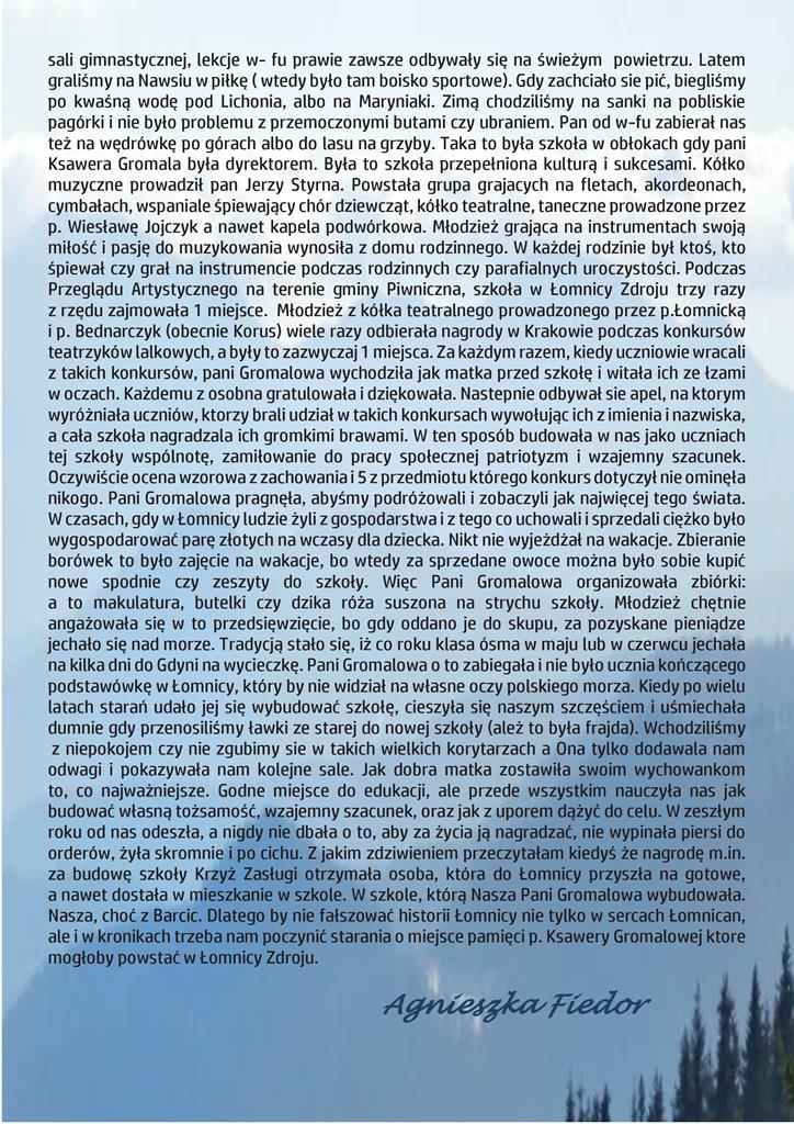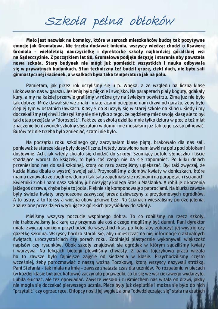 Mało jest nazwisk na Łomnicy, które w sercach mieszkańców budzą tak pozytywne emocje jak Gromalowa. Nie trzeba dodawać imienia, wszyscy wiedzą: chodzi o Ksawerę Gromala - wieloletnią nauczycielkę i dyrektorkę szkoły najbardziej góralskiej wsi na Sądecczyźnie. Z początkiem lat 80, Gromalowa podjęła decyzję i starania aby powstała nowa szkoła. Stary budynek nie mógł już pomieścić wszystkich i nauka odbywała się w prywatnych budynkach. Stan techniczny też budził grozę, ciekł dach, nie było sali gimnastycznej i łazienek, a w salkach była taka temperatura jak na polu. … Autor: Agnieszka Fiedor