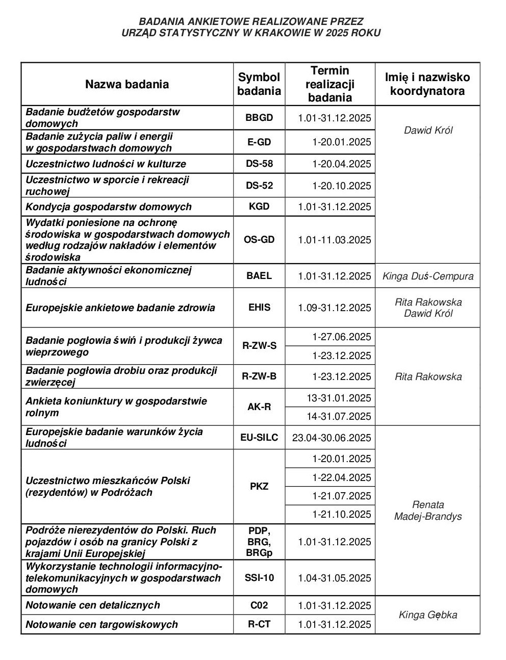 Szanowni Państwo, uprzejmie informuję, że w 2025 roku Urząd Statystyczny w Krakowie będzie przeprowadzał na terenie województwa małopolskiego liczne badania ankietowe. Podstawę prawną realizacji badań statystycznych stanowi ustawa z dnia 29 czerwca 1995 r. o statystyce publicznej (Dz. U. z 2024 r. poz.1779) oraz coroczne rozporządzenie Rady Ministrów w sprawie programu badań statystycznych statystyki publicznej na dany rok.