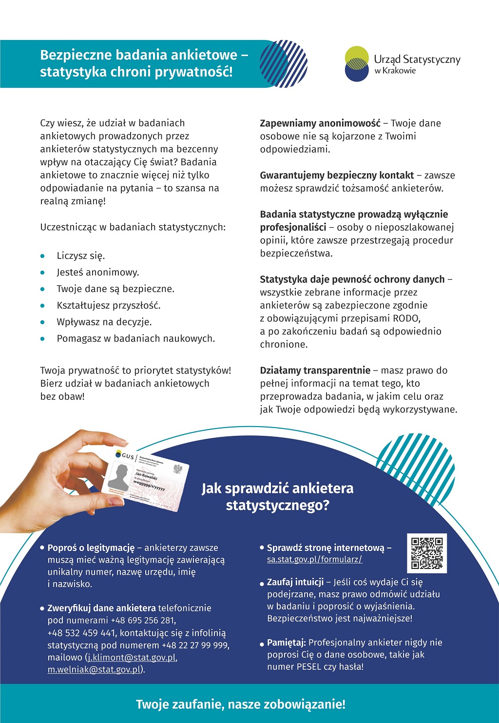 Krakowie w zakładce Badania ankietowe w Małopolsce https://krakow.stat.gov.pl/badania-ankietowe-w-malopolsce/ umieściliśmy kompleksowy zestaw wiadomości dotyczących pracy ankieterów statystycznych. Można się z nich dowiedzieć m.in. jak sprawdzić tożsamość ankietera, jakie badania ankietowe, w jakim celu i w jakich terminach prowadzimy w danym roku oraz jakie pytania zadajemy w naszych formularzach.