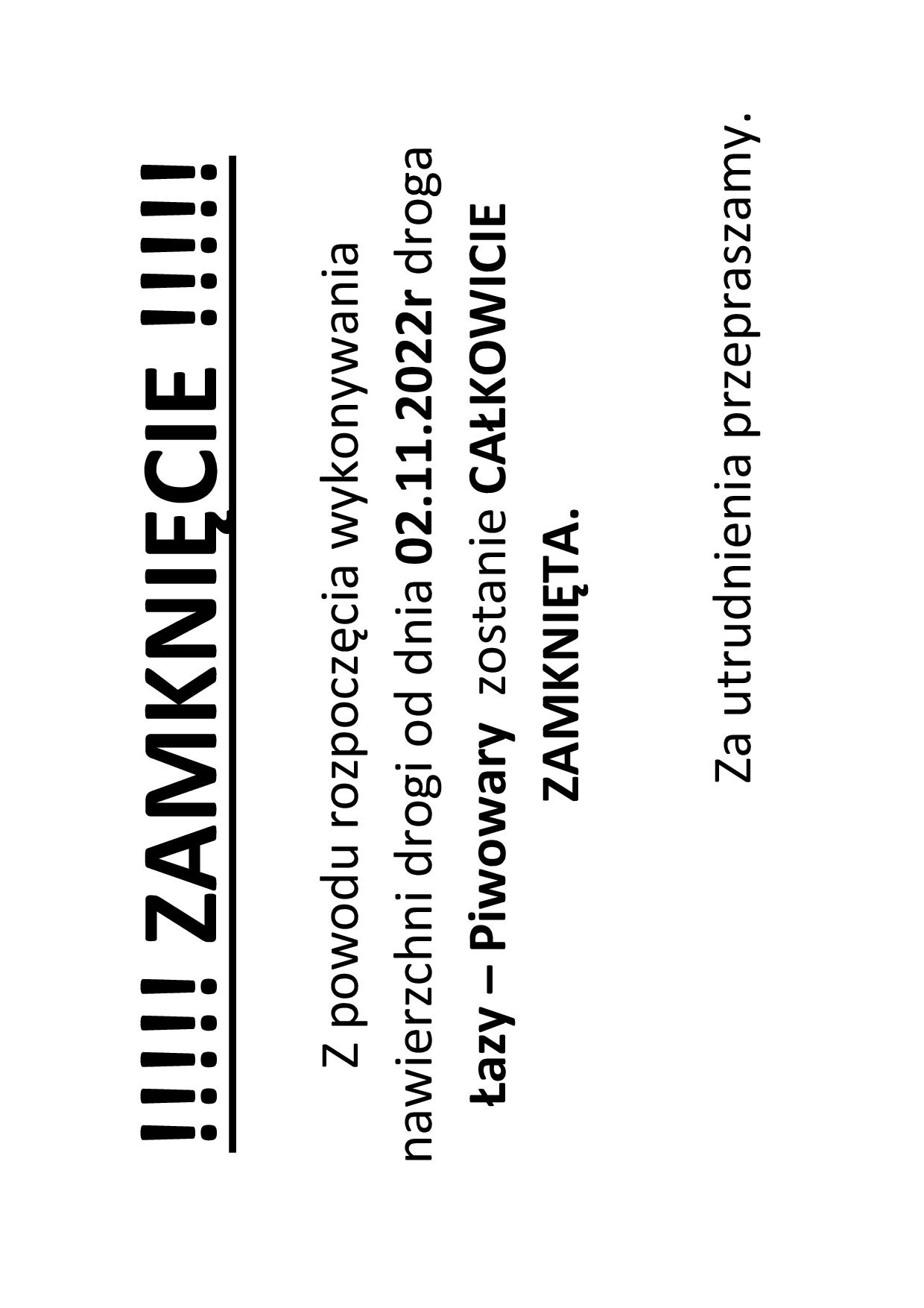 UWAGA! Droga Łazy - Piwowary całkowicie zamknięta od dnia 02.11.2022 r.