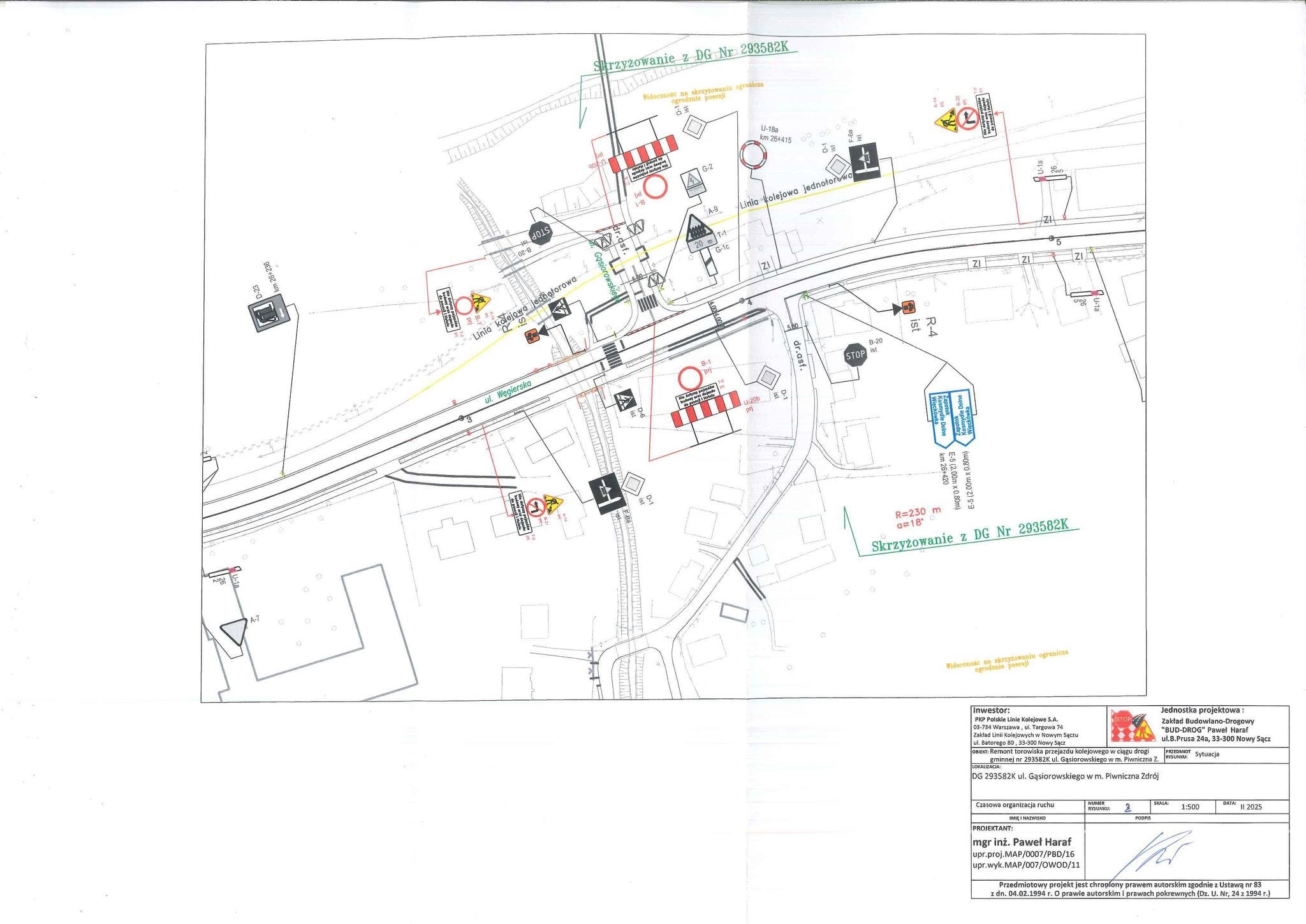 Projekt czasowej zmiany organizacji ruchu na czas naprawy przejazdu kolejowego w ciągu drogi gminnej ul. Gąsiorowskiego (DG 293582K) w m. Piwniczna-Zdrój - Zamknięcie odcinka drogi gminnej na czas wymiany podtorza i szyn