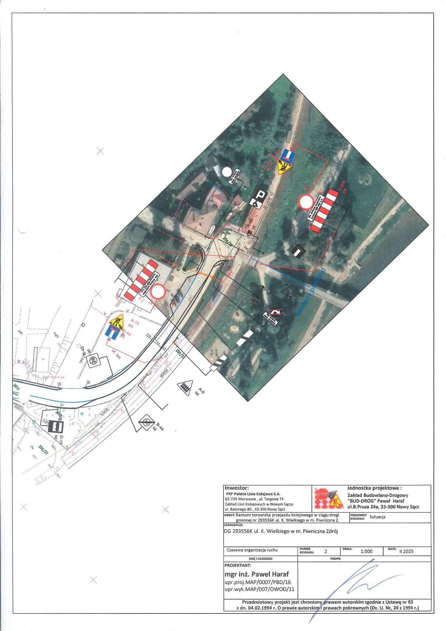 Projekt czasowej zmiany organizacji ruchu na czas naprawy przejazdu kolejowego w ciągu drogi gminnej ul. K. WIelkiego (DG 293556K) w m. Piwniczna-Zdrój - Zamknięcie odcinka drogi gminnej na czas wymiany podtorza i szyn