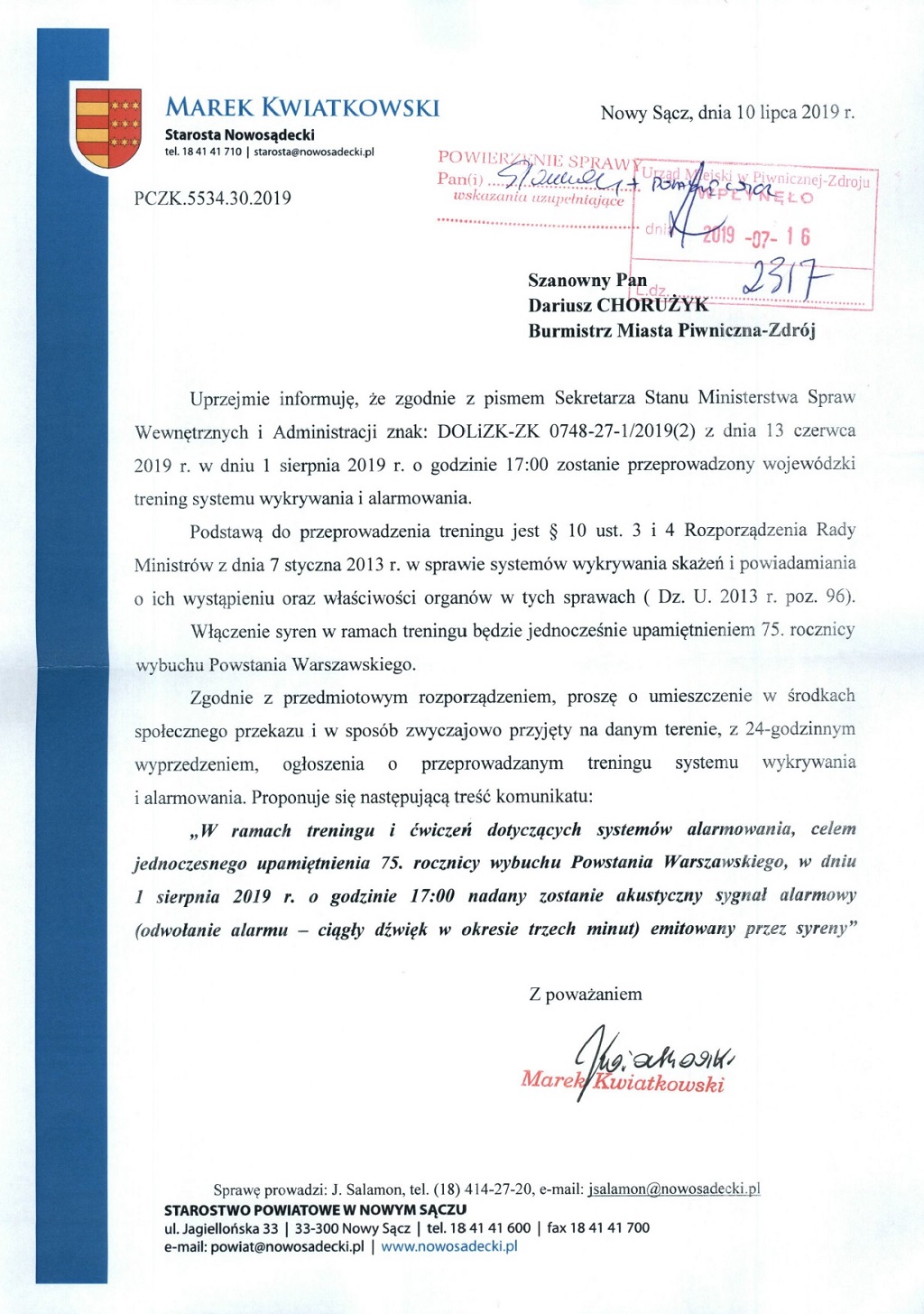 W ramach treningu i ćwiczeń dotyczących systemów alarmowych, celem jednoczesnego upamiętnienia 75 rocznicy wybuchu Powstania Warszawskiego, w dniu 1 sierpnia 2019 r. o godzinie 17:00 nadany zostanie akustyczny sygnał alarmowy (odwołanie alarmu - ciągły dźwięk w okresie trzech minut) emitowany przez syreny.