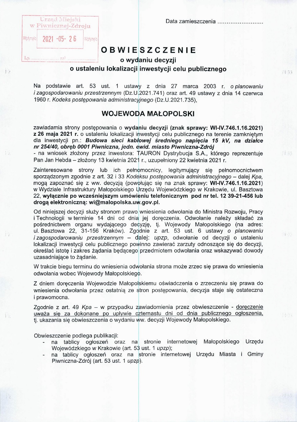 Wojewoda Małopolski. OBWIESZCZENIE o wydaniu decyzji o ustaleniu lokalizacji inwestycji celu publicznego