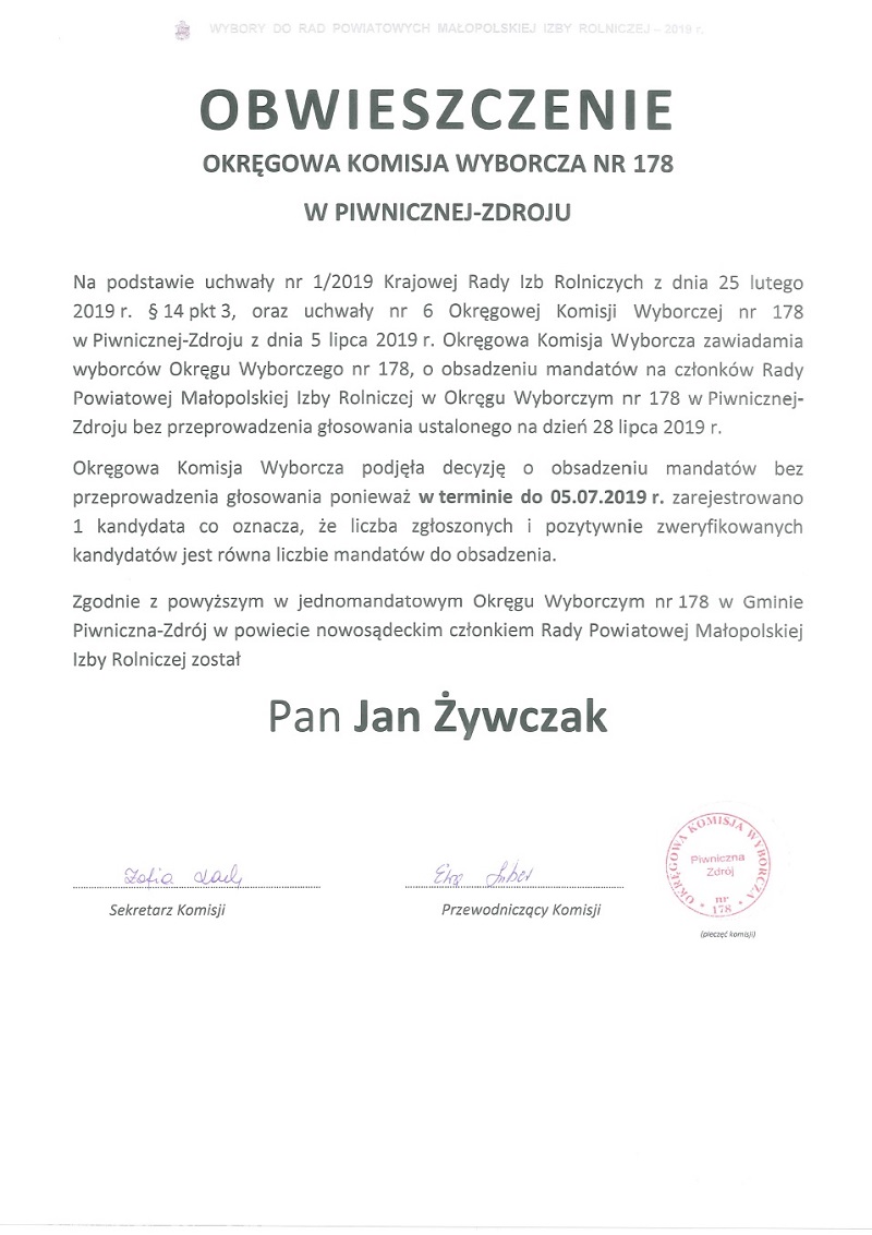 Burmistrz Piwnicznej-Zdroju informuje, że Krajowa Izba Rolnicza Uchwałą nr 2/2019 z dnia 21 lutego 2019 r. zarządziła wybory do walnych zgromadzeń izb rolniczych w tym Małopolskiej Izby Rolniczej z siedzibą w Krakowie. Termin wyborów wyznaczony został na dzień 28 lipca 2019 r.