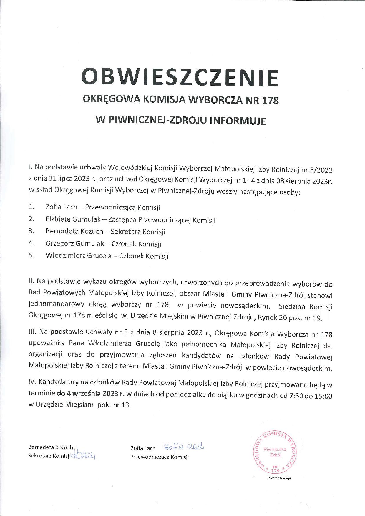 - OBWIESZCZENIE Okręgowa Komisja Wyborcza nr 178 w Piwnicznej-Zdroju dot. o nieobsadzeniu mandatu na członka Rady Powiatowej Małopolskiej Izby Rolniczej