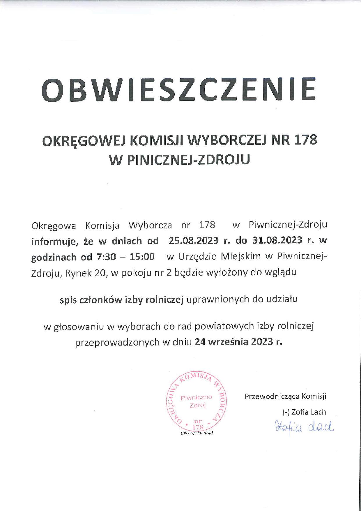 - OBWIESZCZENIE Okręgowa Komisja Wyborcza nr 178 w Piwnicznej-Zdroju dot. spisu członków izby rolnicznej uprawnionych do udziału