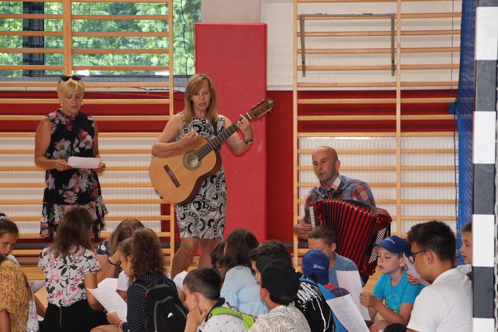 Na uroczystym podsumowaniu i zakończeniu spotkały się wszystkie grupy. Na wstępie pani Urszula Sikorska – p.o. Dyrektor ZEAS-u złożyła w imieniu Burmistrza Dariusza Chorużyka podziękowanie dla kierowników i wychowawców półkolonii, następnie dzieci wspólnie odśpiewały piosenkę kolonijną.