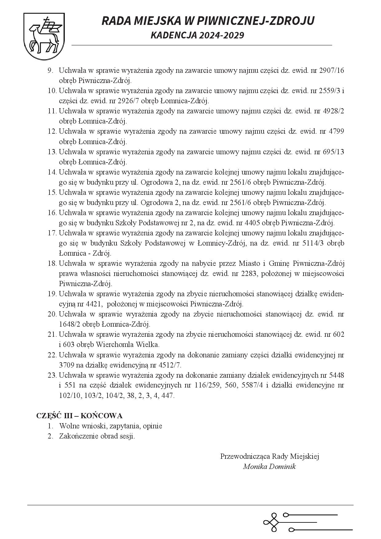 - 9. Uchwała w sprawie wyrażenia zgody na zawarcie umowy najmu części dz. ewid. nr 2907/16 obręb Piwniczna-Zdrój.