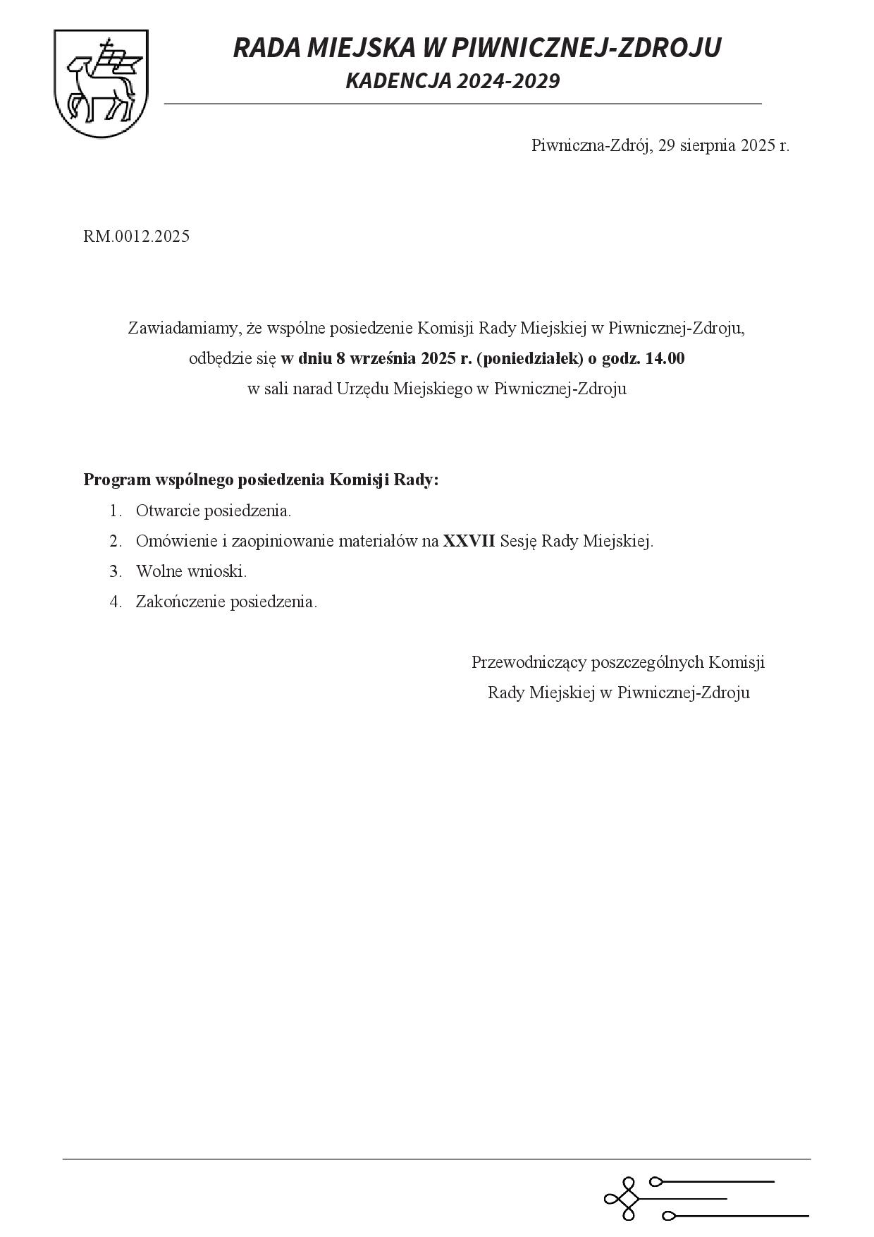 - XXVII Sesja Rady Miejskiej w Piwnicznej-Zdroju 08.09.2025 r. o godz. 16:00 (poniedziałek)