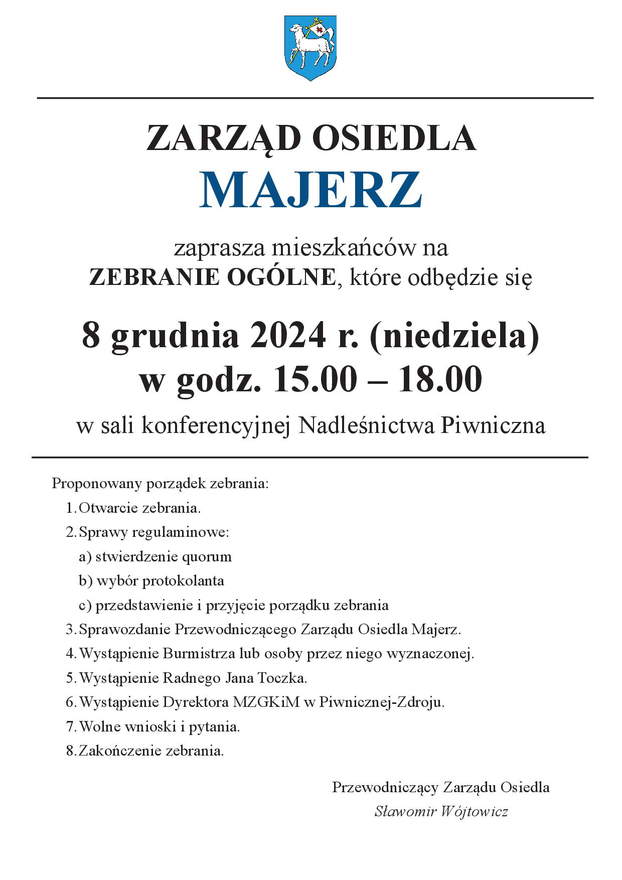 Zarząd Osiedla MAJERZ zaprasza na ZEBRANIE OGÓLNE w dniu 08.12.2024 r. (niedziela) w godz. 15:00-18:00