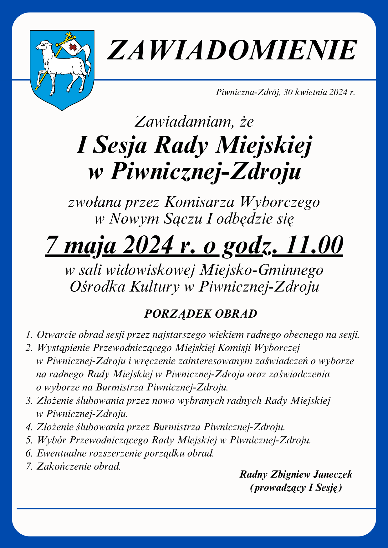ZAWIADOMIENIE I Sesja Rady Miejskiej w Piwnicznej-Zdroju 07.05.2024 r. o godz. 11:00 w sali MGOK w Piwnicznej-Zdroju