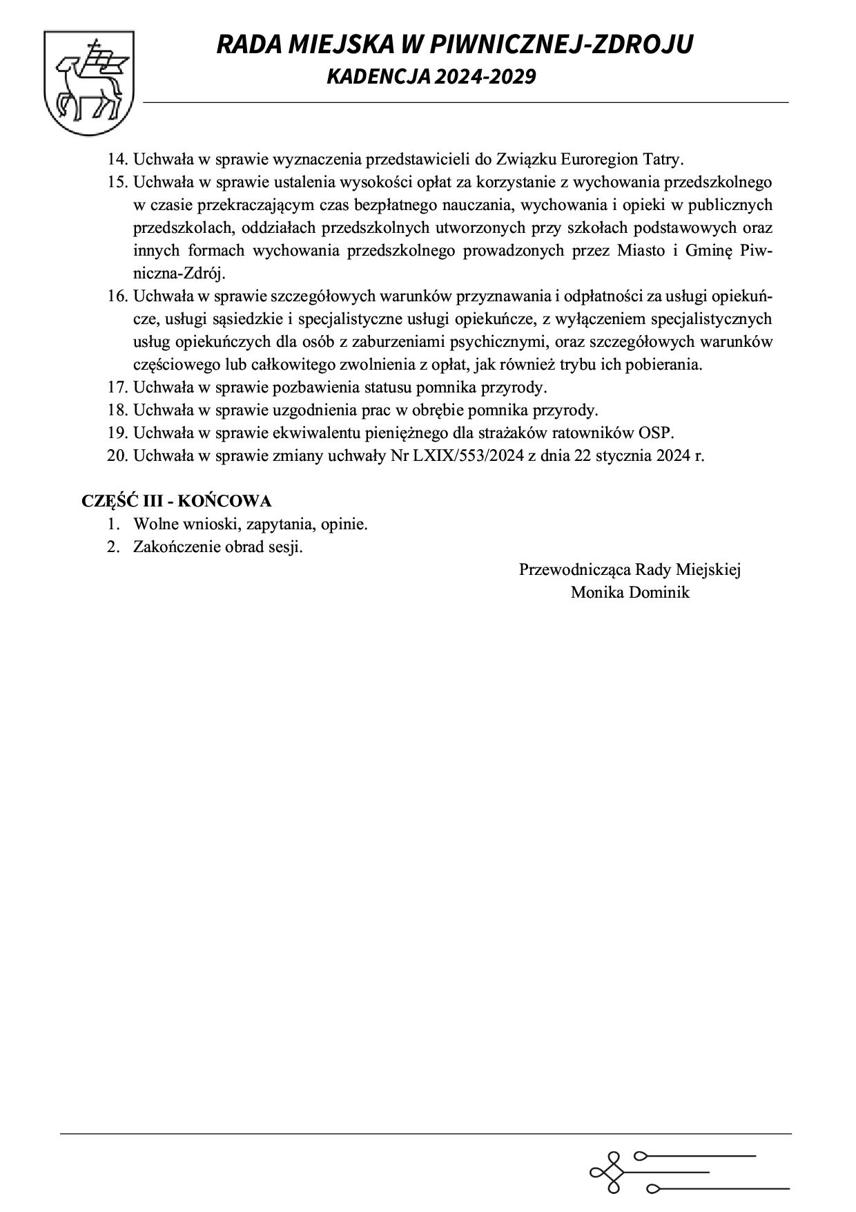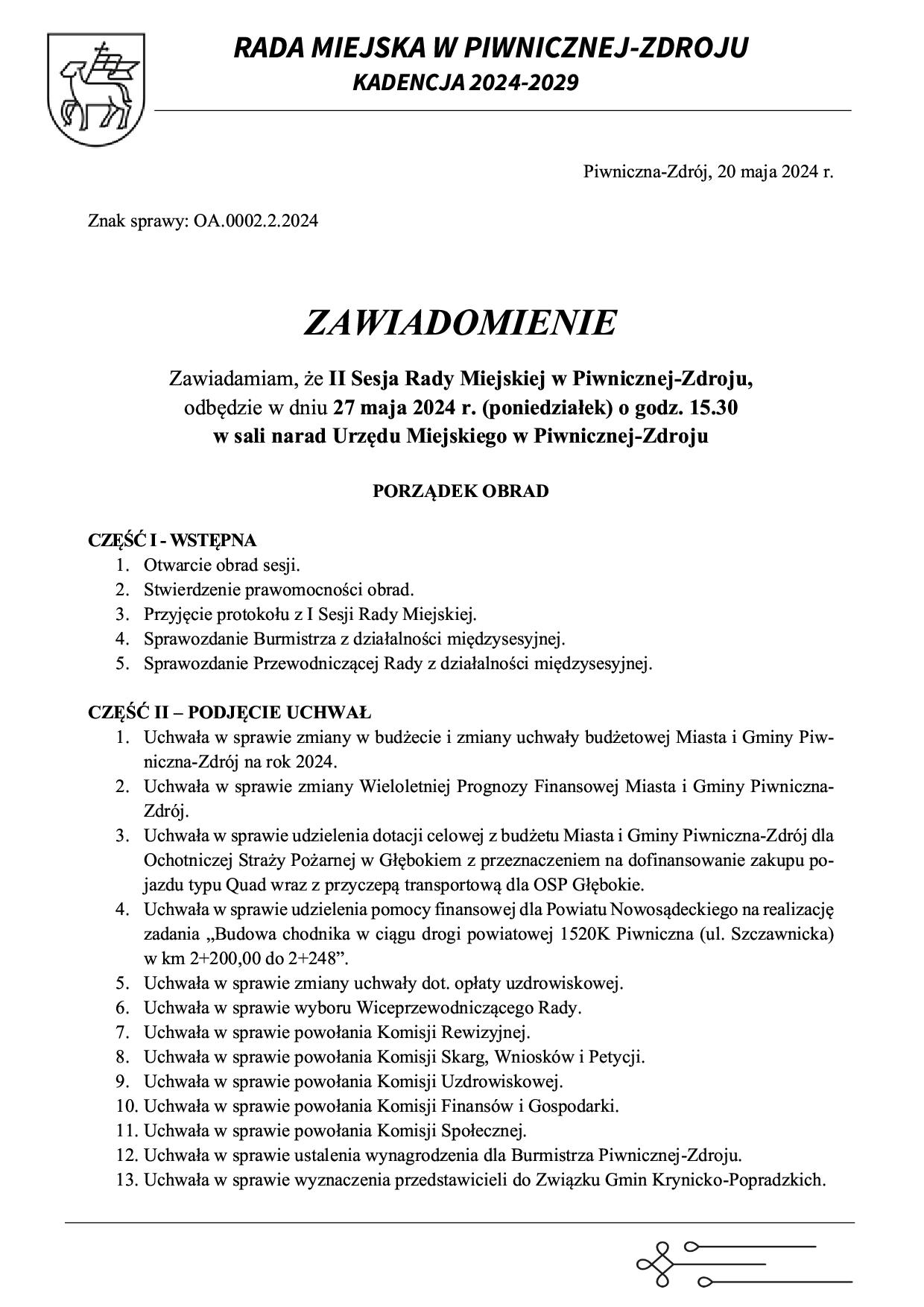 - Porządek Obrad II Sesja Rady Miejskiej w Piwnicznej-Zdroju 27.05.2024 r.