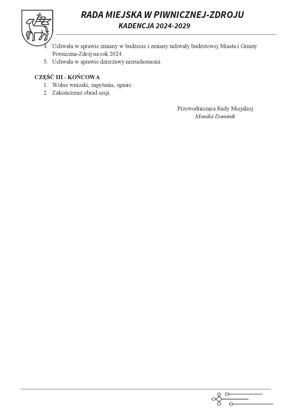ZAWIADOMIENIE IV Sesja Rady Miejskiej w Piwnicznej-Zdroju w dniu 27.06.2024 r. (czwartek) o godz. 15:30